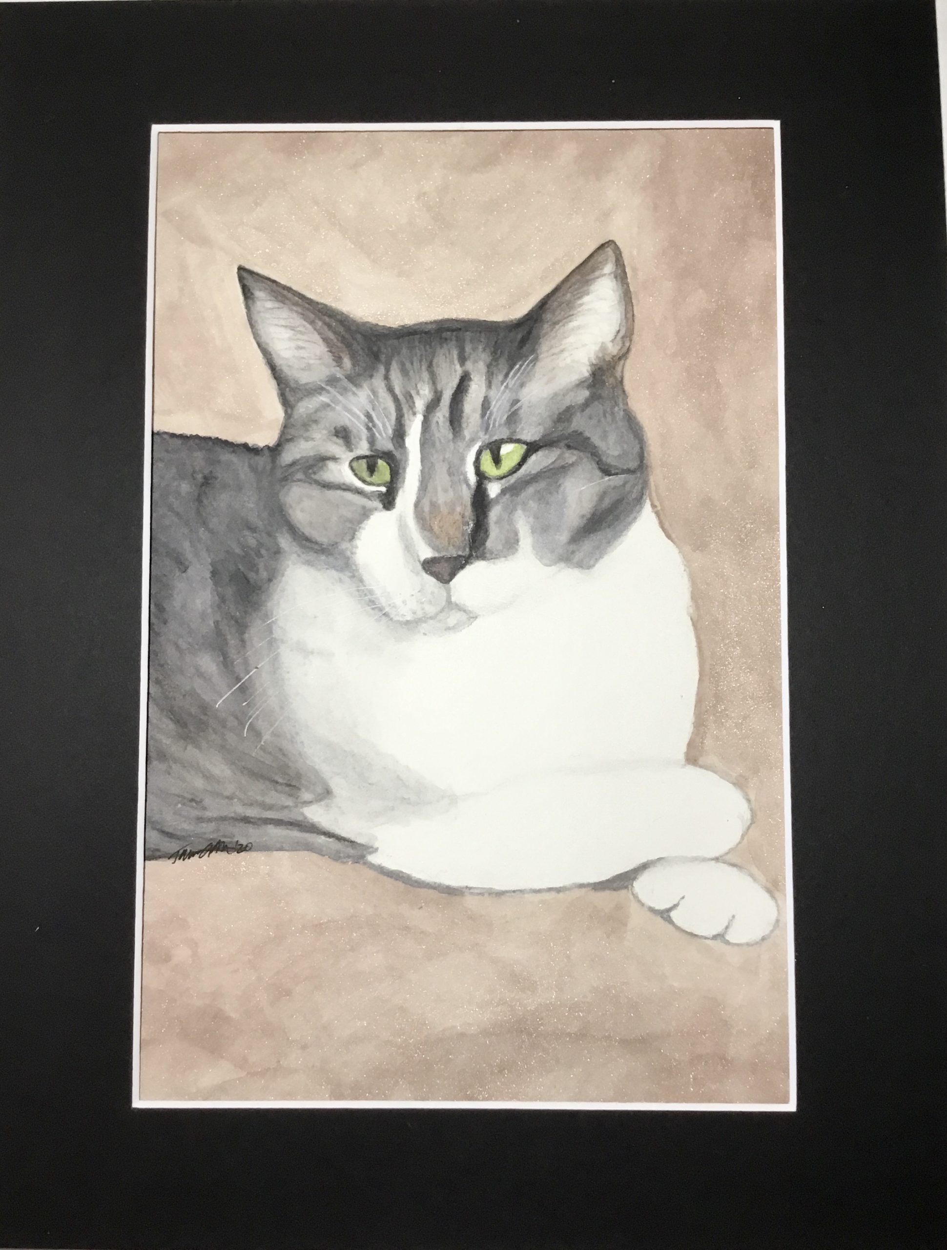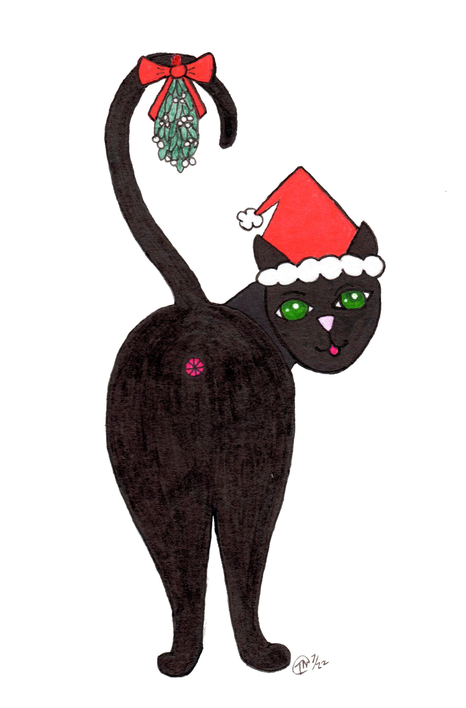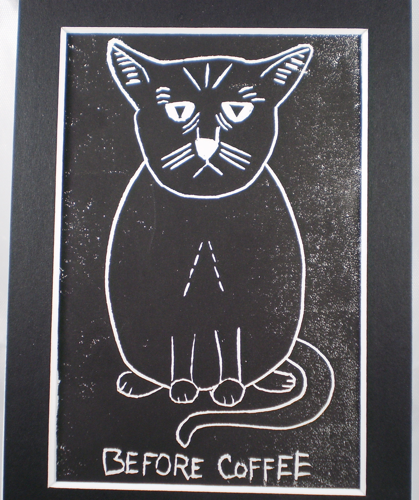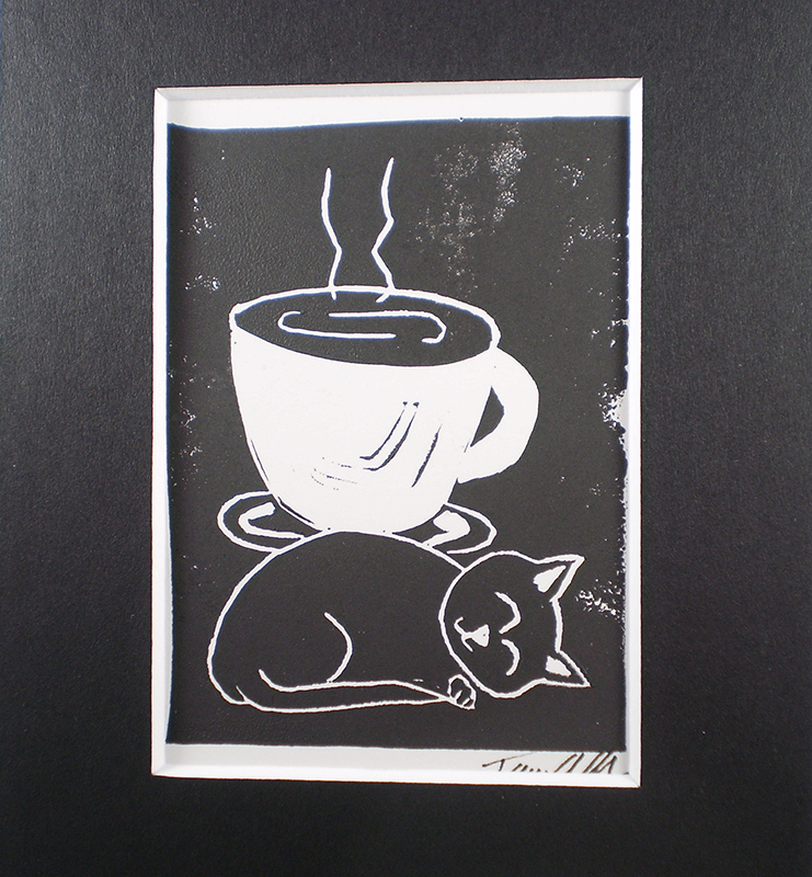 I’m a mixed media artist and purrveyer of whimsically cute designs. Most designs will fit both 4×6 & 5×7 mats. Some small designs look best on 4×6 mats and others look best on 5×7 mats. Some of the designs fit both 5×7 & 8×10 mats. Some designs will only fit 8×10 or 8.5×11 size mats. A few of my block print designs were popular enough I made 2nd versions that fit the smaller mats but some of the larger designs I can’t do that with. My mixed media designs can be resized to any of my standard mat sizes. I also have greeting cards (individual & sets), vinyl stickers, magnets, hand block printed bags & dish towels, tote bags, cat butt earrings, ornaments, and keyrings.